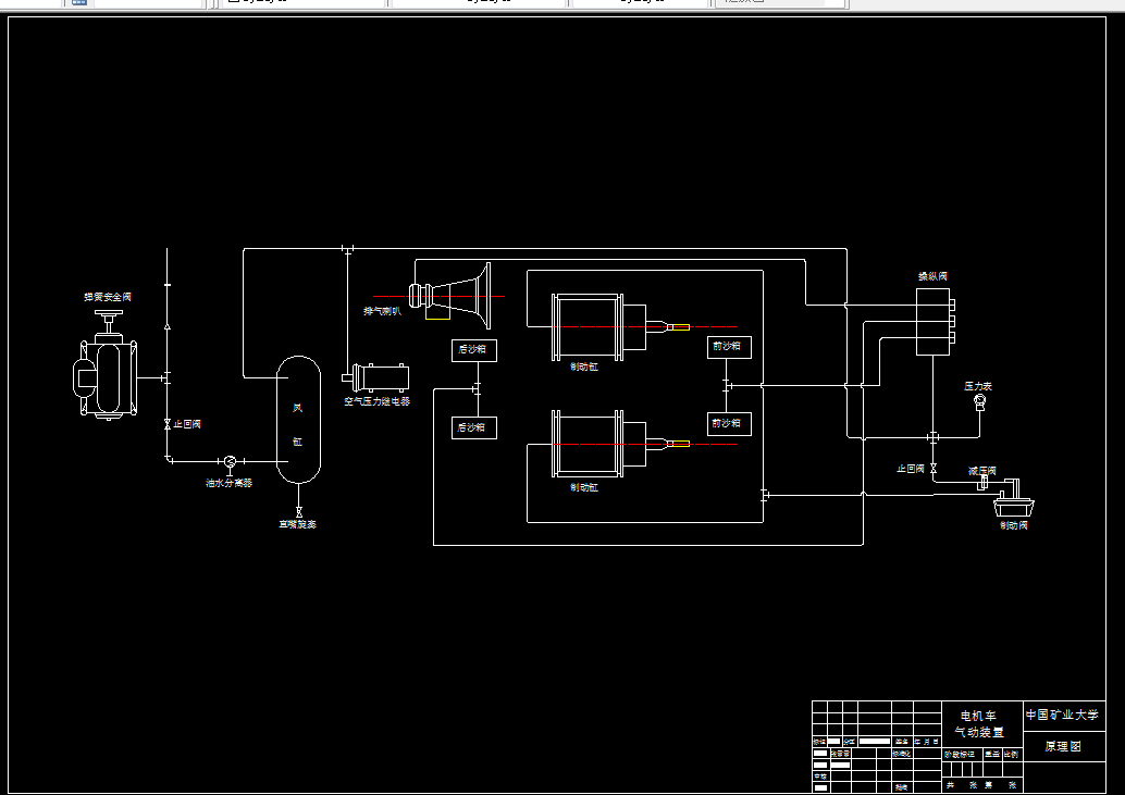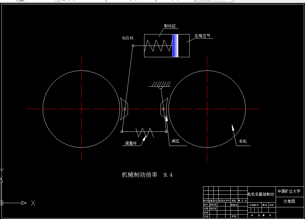 电机车的气制动改造设计计算,主要计算制动气缸的工作推力,选择合适的制动气缸,计算制动气缸的排气量等。根据空气系统原理,设计电机车的气制动气路图。