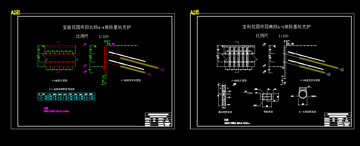 (3)钻孔灌注桩:4-4坡段沿基坑外边线布置钻孔灌注桩,桩径Ф600mm,桩顶标高0.0m,嵌入基坑底2.30m,桩间距1.6m。混凝土强度等级为C30;