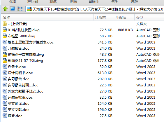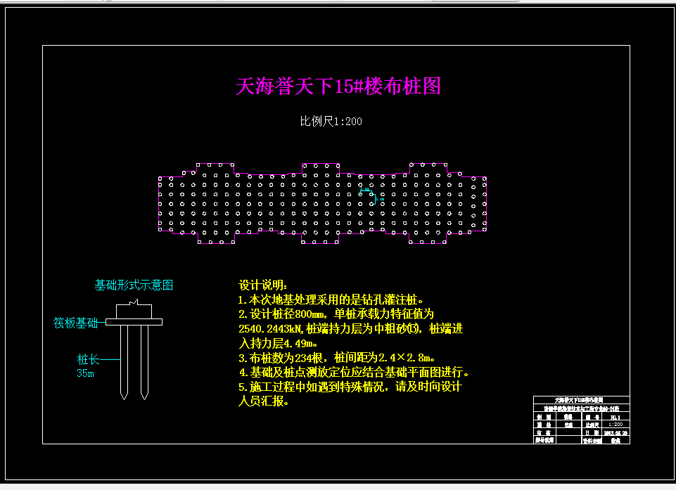 此次设计是在东王旧村改造—天海誉天下15#楼勘察资料的基础上进行的桩基设计。该项目是高层建筑的地基处理工程,经过勘察得出,为满足地基处理稳定性要求,采用桩基础。在桩基础的设计过程中,要先确定桩的规格和单桩竖向承载力,根据单桩竖向承载力大概确定桩的数量和平面布置,把这些得到的数据再进行验算,看是否能满足符合实际情况下的承载力要求。这是一个反复进行的过程,直到结果满足为止。光满足承载力还是不够的,还要能保证建筑物建成使用后,桩基沉降不能超过某一限制,如果前面的设计不满足这个要求,还是要重新对桩基础进行设计。