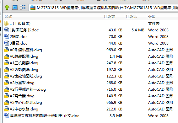 设计中所介绍的采煤机截割部适用于倾角 的中厚煤层和厚煤层的开采。它的传动方式为:电动机—摇臂—行星齿轮传动—滚筒。这种传动方式的电动机轴与滚筒轴平行,取消了容易损坏的锥齿轮,使传动更加简单。截割电机横向布置在摇臂上,摇臂和机身连接没有动力传递,取消了纵向布置结构中的螺旋伞齿轮和结构复杂的通轴。