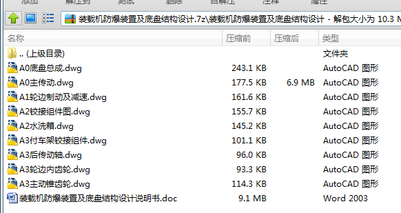 本次设计的内容为装载机防爆装置及底盘设计,分为转向装置设计,车架设计,主传动设计,差速器设计,半轴设计,最终传动设计以及轮边制动设计。其中主传动采用单级主传动,锥齿轮采用35°螺旋锥齿轮,所以主传动的结构和锥齿轮的基本参数及几何参数的计算是本次设计的重点。设计完后又对主传动的各部分进行受力分析和校核。另外对装载机的行走系、传动系、制动系以及防爆系等结构和原理进行了分析,同时按设计条件,对它们的结构和尺寸进行了设计。本次设计差速器选择普通差速器,半轴采用全浮式,最终传动采用轮边行星减速器,车架为两点铰接车架,后车架采用摆动式车架。