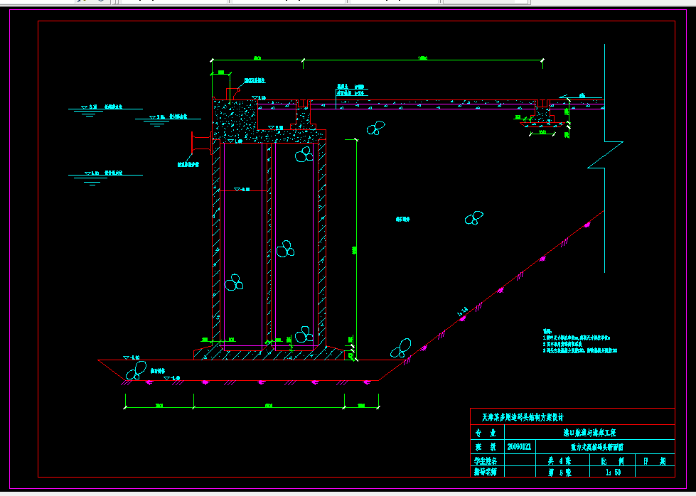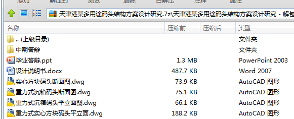 天津港某多用途码头结构方案初步设计主要以码头主要尺度确定、结构选型、码头主要结构和构件的设计、码头的施工组织设计和码头方案比选等为主要内容。根据参考资料和当地的环境初步选定两种合适结构,分别为重力式实心方块和重力式沉箱结构。