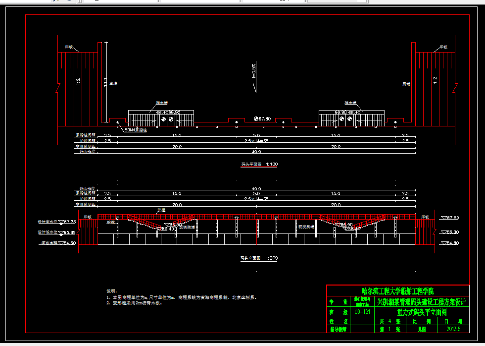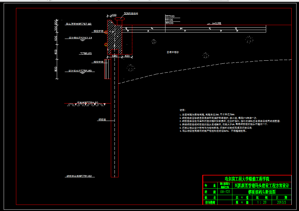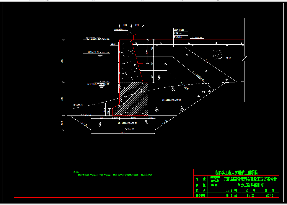 在方块码头结构的设计中主要是考虑了在设计高、低水位下的结构的自重力作用、主动土压力和被动土压力的作用、码头面上的人群均布荷载的作用及船舶的系缆力作用,由于兴凯湖属于内河港,不考虑波浪对码头的影响。主要进行持久组合情况下的结构设计,经过计算来验算抗滑、抗倾稳定性;在进行钢板桩结构设计时,由于码头高度较小,不采用拉杆,为无锚板桩结构。计算高、低水位下的板桩入土深度及板桩受到的最大弯矩,确定最佳入土深度及钢板桩类型。论文的最后进行了工程量与工程概预算的计算。论文中的图纸均为AutoCAD绘制。