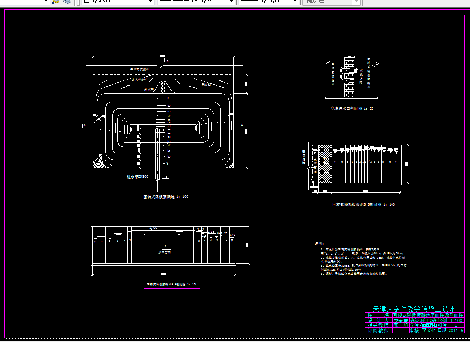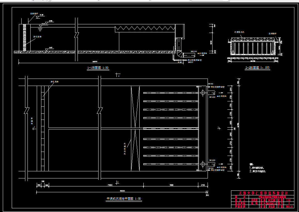 本设计为许昌市某区给水工程工艺设计,设计水量满足最高日供水量8.5×104m3/d。设计的主要内容为:溶液池、溶解池、混合设备、絮凝池、沉淀池、滤池、消毒方法、清水池、二泵站等。根据最高日供水量及自用水量,拟定处理构筑物的设计流量,并根据确定的净水厂位置,选择适宜采用的处理构筑物,确定设计采用的处理构筑物的形式及数量。在进行构筑物的设计计算时,确定各构筑物和各主要构件的尺寸并绘制部分简图,并且绘制各构筑物的平面图、剖面图和水厂高程图及总平面布置图。设计时还需考虑到构筑物及其构件在施工上的可能性,并符合要求。同时,根据原水水质、水量、地区条件、施工条件和给水厂的运行情况,确定给水厂的处理工艺流程。其工艺流程为:原水→管式静态混合→回转式隔板絮凝池→平流式沉淀池→普通快滤池→液氯消毒→清水池→二泵站→城市供水管网。