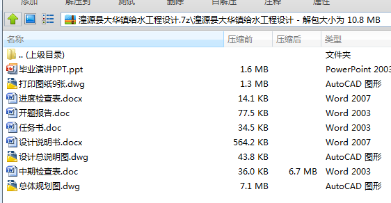 图纸部分共11张,包括:工程设计总说明、大华镇总体规划图、送水泵房平剖图、加药间平剖图、取水泵房平剖图、水厂平面布置图、机械搅拌澄清池平剖图、普通快滤池平剖面图、清水池平剖面图、水厂高程布置图、管网平面布置图。