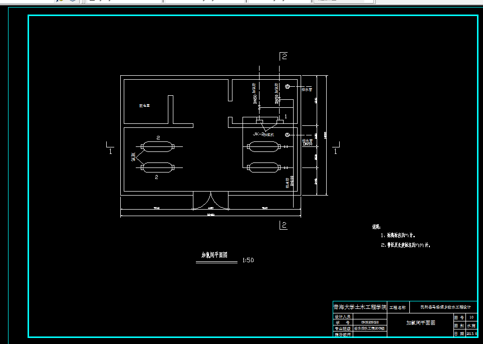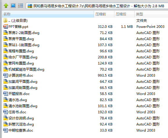 图纸分别为:给水厂平面图、给水厂高程图、管网布置平面图、加氯间平面图,加氯间剖面图、二泵站平面图,二泵站剖面图、清水池平面图,清水池剖面图,斜管沉淀池示意图,机械絮凝池平面图,给水系统设计总说明。