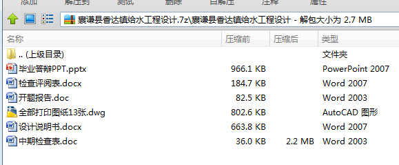 本设计设计内容分三个部分:取水工程设计、给水厂设计、城镇输配水管网设计。主要内容有:水源地选择、取水方式及构筑物设计、确定水厂规模,选择净化工艺流程及净化构筑物型式、主要构筑物的设计计算与高程计算、城镇输配水管网的布置形式设计、主要干管、支管的设计流量及管径、高程计算。