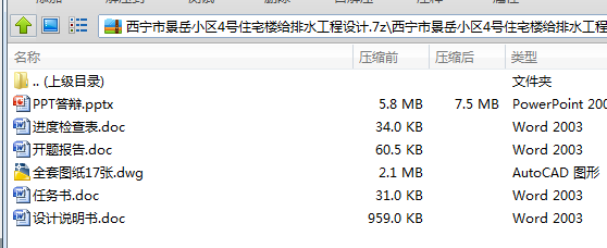 设计的大体内容是:建筑给水工程、排水工程和消防工程,设计的意义在于满足人们生活用水的同时,要满足室内的消防用水,保证人们居住的安全性。设计的依据为相关书籍和设计手册、规范。在设计中,大都按照常规方法,严格依据设计手册中的相关规范来进行,建筑给水排水系统及卫生设备要相对完善,在技术上要保持先进的水平,在计算的过程中,尽量使用符合经济流速的管径,以便降低成本,同时要考虑水的漏失、压力情况来选择管材和一些连接管件,以便在水从市政管网输送到建筑内用户的过程中,水的漏失量最少,节约水资源。