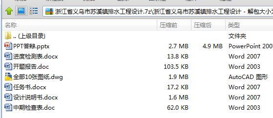 图纸部分共10张,包括:工程设计总说明、污水干管平面布置图、雨水干管平面布置图、污水厂平面布置图、细格栅与沉砂池平剖面图、辐流式初沉池平剖面图、改良SBR平剖面图、浓缩池平剖面图、污水厂高程布置图,污水干管纵断面图。