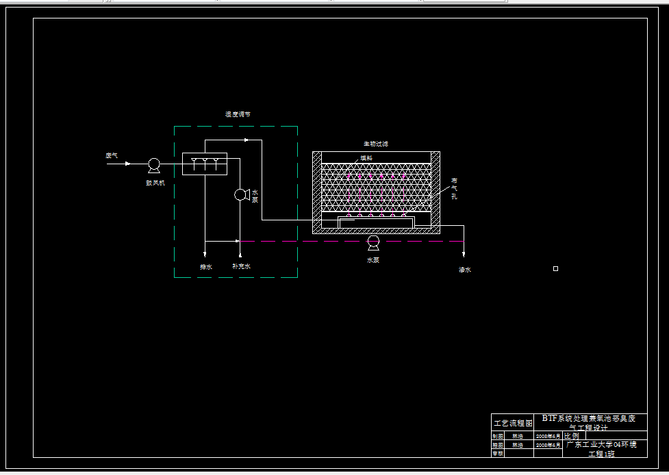 本毕业设计方向是采用生物法处理低浓度恶臭气体的设计,既是BTF系统处理兼氧池恶臭废气工程设计,BTF系统就是指生物滴滤池系统。考虑到工程实际经济可行性本毕业设计决定采用生物滴滤池工艺。设计以阔叶林树木材锯末为填料,通过将气体加湿,调节PH值,使气体中的恶臭成分在微生物的作用下分解为二氧化碳和水。具体内容是在气流量确定的情况下设计生物滴滤池等设备以净化恶臭气体其中包括集气罩、管道布置、风机选择、鼓风机房、填料等各方面的设计计算,以实现90%祛除恶臭污染物的最终效果。
