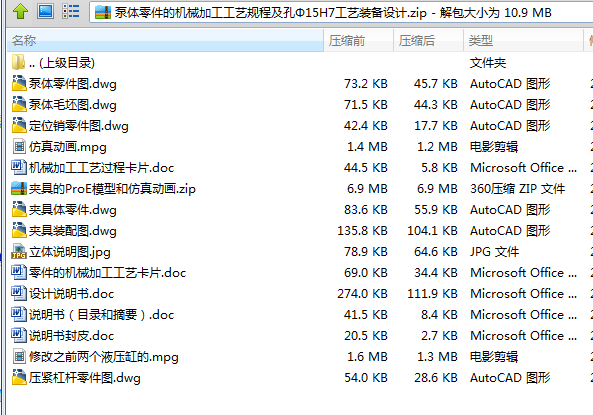 设计内容为设计泵体零件的机械加工工艺规程及工艺装备,并绘制出泵体零件图、毛坯图、夹具体零件图和夹具装配图,填写机械加工工艺过程综合卡片和编制所设计夹具对应的那道工序的机械及啊工工艺卡片,并编制课程设计说明书。
