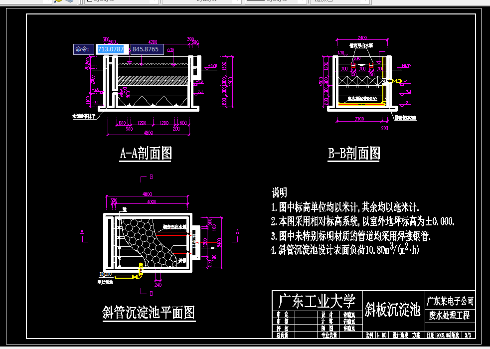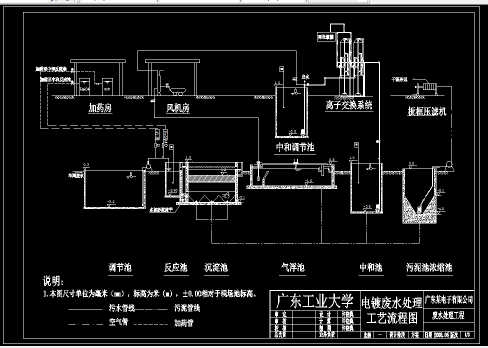 本设计采用化学处理法对酸性综合电镀废水进行深度处理,通过斜管沉淀与气浮装置去处废水中的Cu2+、Ni2+,并使COD大大减少。设计参数:水量1000m3/d,Cu2+ 50mg/L,CODcr800mg/L,Ni2+10mg/L,pH=2.5~3.5。排放标准值:pH=6~9,CODcr≤100mg/L,Cu2+ ≤1.0mg/L,总镍≤1.5mg/L,Ni2+≤1.0mg/L。处理后出水达到广东省地方一级标准(DB44/26—2001)。
