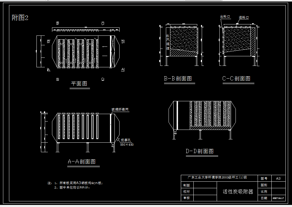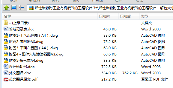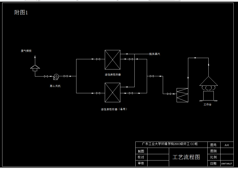 本设计将介绍一种有效且最广泛使用的工业有机废气的净化技术—活性炭吸附法。本设计利用活性炭固定床吸附系统对工业有机废气进行净化。经过该系统之前,废气会先用干式除尘器进行预处理,去除废气中的雾状物及粉尘,从而避免了这些物质堵塞活性炭微孔,影响活性炭的吸附效性能。而在活性炭吸附器的设计上,本文采用了卧式多层设计。选用活性炭为吸附剂,具有吸附性能好,流体阻力小的特点。