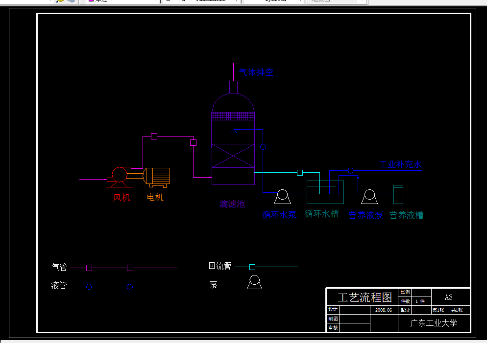 本文主要着重于对生物滴滤池的设计及设备的选取。首先,本文概述了恶臭气体的控制现状及生物净化的原理;其次,本文详细地讲述了各种生物净化工艺的原理和特点;再次,本文对14200 m3/h的恶臭气体进行初步的计算,以确定后续设备的选择;最后,本文根据上述的计算进行设备的选取和调试。