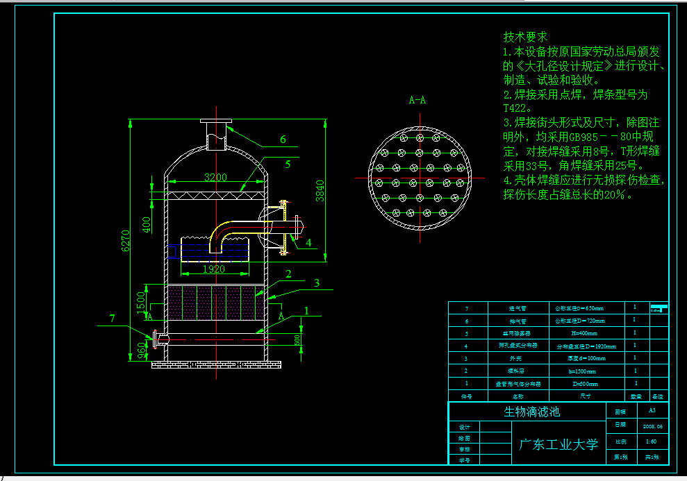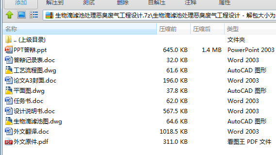 本设计主要是以生物滴滤池来处理某炼油厂所散发出14200 m3/h的恶臭气体。首先浓度为300.0~400.0 mg/m3的恶臭气体经气管在风机的输送下,然后调节阀门使气体以0.49m/s的气速进入生物滴滤池中。在生物滴滤池的微生物作用下,大部分的恶臭被微生物吸收、分解,因此14200 m3/h的恶臭气体就能按地方气体排放标准合格排放,从而达到去除恶臭污染的目的。