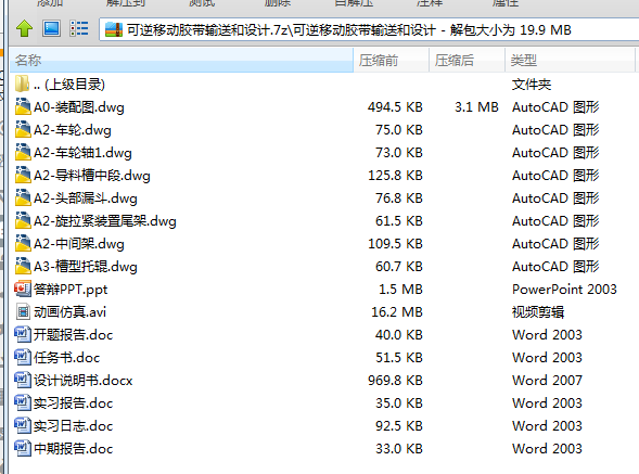 本次的设计为可逆移动带式输送机。首先对可逆移动输送机稍稍作了比较简单的说明与介绍;然后根据各种设计手册提到的设计准则,按照给定的参数和要求去选造型,和设计各种参数;然后对输送机的几个主要零部件进行校核。本次设计主要是计算了传动装置中各个参数,从而选出了传动电机,联轴器等等,同时,通过各种计算得到了输送带的选型和头尾架,中间架等的选型。在当今社会,输送机变得越来月长距离,速度也越来越快了,同时,为了适应社会的生产,也变得越来越灵活了,因此,可以移动的输送机也因此诞生了。可以说,可逆移动输送机是现代化产物,同时也是时代进步的产物。