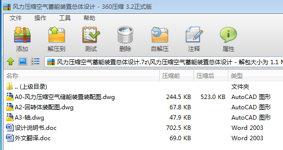 风能为无污染的再生能源,我国的风力资源丰富。因而在我国风力发电机作为最常见的运用。由于风力时有时无,风向和风力也不断的变化,因而风力机一般都配有电力存储装置,将产生的电能存储起来,从而加强了风力发电机的稳定性。但是风力发电机的工作过程能量发生了多次的转换,因而也产生了大量的能量损失,从而影响了风力发电机的效率,本设计研究风力压缩空气储能装置来攫取并储存风能。风能带动风车直接转动,风车连接空气压缩机,攫取风能以后转化为动能来直接带动压缩机压缩空气,使产生的高压气体储存于储存装置,使动能转换为压缩位能。并设计了配套的风机叶片、增速器、刹车装置、调向装置和调速装置。