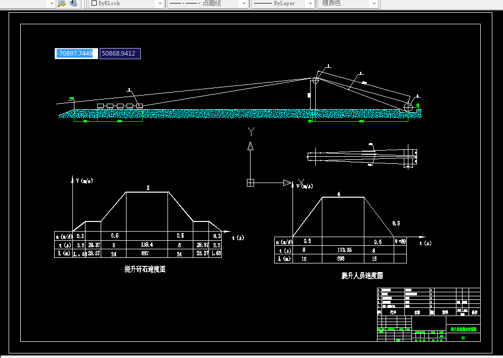 下面是我针对矿井的地质、煤层等情况,本着经济、安全原则对煤矿副井提升设备进行选型计算,并根据《煤矿安全规程》验算其合理性。验算结果合理后,根据各设备外形尺寸及安装要求,并考虑运行条件,最终确定提升机房布置图和井上相对位置图。