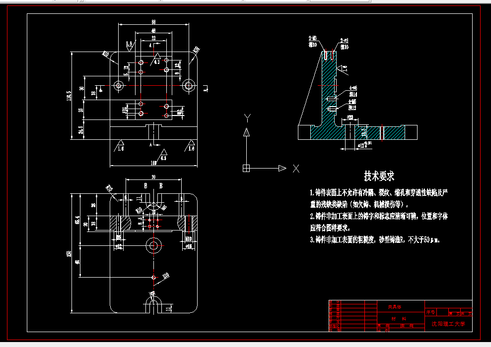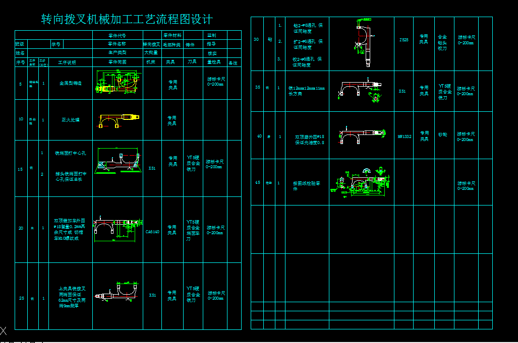 转向拨叉加工工艺规程及夹具设计是包括零件加工的工艺设计、工序设计以及专用夹具的设计三部分。在工艺设计中要首先对零件进行分析,了解零件的工艺再设计出毛坯的结构,并选择好零件的加工基准,设计出零件的工艺路线;接着对零件各个工步的工序进行尺寸计算,关键是决定出各个工序的工艺装备及切削用量;然后进行专用夹具的设计,选择设计出夹具的各个组成部件,如定位元件、夹紧元件、引导元件、夹具体与机床的连接部件以及其它部件;计算出夹具定位时产生的定位误差,分析夹具结构的合理性与不足之处,并在以后设计中注意改进。