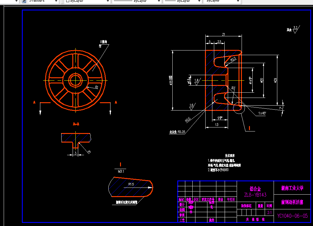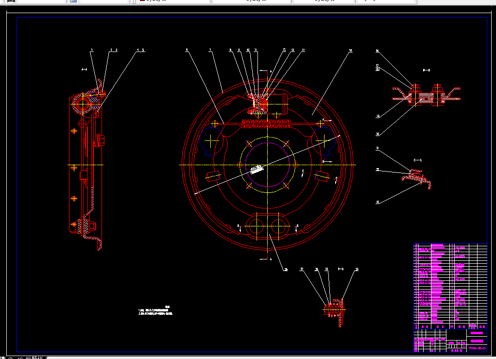 制动器设计的主要工作有:制动器的结构方案分析,对比各种形式结构的优缺点后,选用了领从蹄式的方案;制动器主要参数的确定,先参考相关专业标准确定制动鼓内径,然后根据制动鼓内径就可以定下摩擦衬片宽度和包角、摩擦衬片起始角、制动器中心到张开力F作用线的距离、制动蹄支承点位置坐标。最后还需要关于制动器的设计计算。