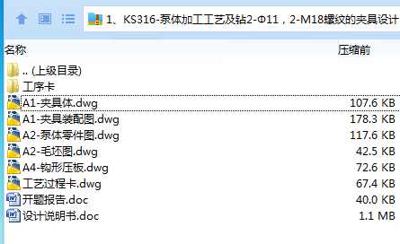 泵体加工工艺规程及其钻2-Ф11孔;钻2-M18 1.5的螺纹底孔Ф15、攻丝2-M18的夹具设计是包括零件加工的工艺设计、工序设计以及专用夹具的设计三部分。在工艺设计中要首先对零件进行分析,了解零件的工艺再设计出毛坯的结构,并选择好零件的加工基准,设计出零件的工艺路线;接着对零件各个工步的工序进行尺寸计算,关键是决定出各个工序的工艺装备及切削用量;然后进行专用夹具的设计,选择设计出夹具的各个组成部件,如定位元件、夹紧元件、引导元件、夹具体与机床的连接部件以及其它部件;计算出夹具定位时产生的定位误差,分析夹具结构的合理性与不足之处,并在以后设计中注意改进。