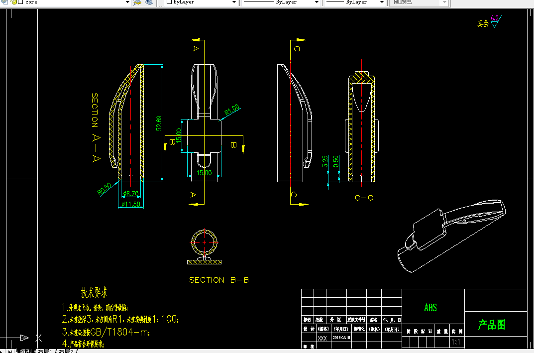 塑料是一种可塑性的合成高分子材料,具有重量轻且坚固,耐化学腐蚀, 电绝缘性好,价格便宜,可塑性好等特点,广泛应用于电脑、手机、汽车、电机、 电器、家电和通讯产品制造中。 注射成形是成形塑件的主要方法之一, 是指使用注射机将热塑性塑料熔体在 高压下注入到模具内经冷却固化获得产品的方法。注射的优点是生产速度快,效 率高,操作可自动化,能成型形状复杂的零件,特别适合大量生产。 本次毕业设计的产品为笔帽,具有重量轻,强度高,耐腐蚀,易清洁等 特点,为大批量生产产品。本次设计在针对产品进行工艺性分析后,确定模具分 型面、 型腔数目、 浇口形式、 位置大小; 其中最重要的是确定型芯和型腔的结构, 以及它们的定位和紧固方式。此外还进行了脱模机构的设计,合模导向机构的设 计,冷却系统的设计等。最后绘制完整的模具装配总图和主要的模具零件图及编 制成型零部件的制造加工工艺过程卡片。实践证明:该模具结构合理、可靠,并 能保证产品质量,对此类注射产品的模具设计有参考价值。