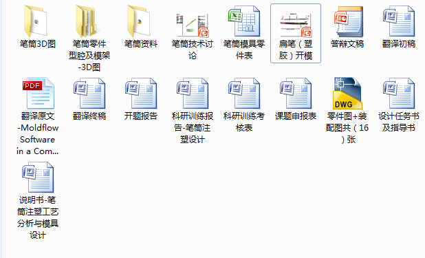 笔筒塑件采用无味、无毒、透明的PC材料注塑成型。该工件具有重量轻、耐腐蚀老化、强度高、使用寿命长、制作方便、价格低廉等特点。分型面选择在笔筒中间剖切面上、型腔确定为一模两腔、型腔排布为平衡对称式、注塑模选用双分型面注塑模、浇口选择为侧浇口、标准模架选用龙记模架(LKM),其型号规格为:AH-2525-A30-B30-C60,模仁尺寸为40x110x15mm,40x110x15mm,选定注射机型号为XS-ZY-125,其螺杆转速为10~140r/min,模板最大厚度为300mm、最小厚度为200mm,机器外形尺寸为3.34×0.75×1.55(m).本次毕业设计运用AutoCAD、Pro/E及EMX软件完成笔筒零件图、笔筒型腔的建立、笔筒注塑模具及笔筒平面工程图的绘制。