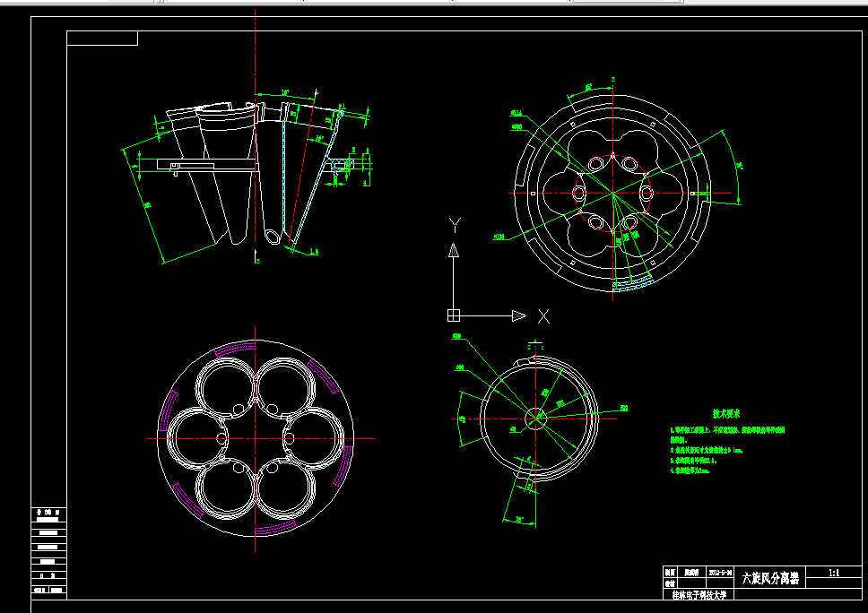 集尘分离装置部分,其由两组旋风分离器构成:上游旋风分离器、下游旋风分离器。上游旋风分离器分离颗粒较大的灰尘、杂质。气体通过中间的网孔进入下游旋风分离器。下游旋风分离器由6个小旋风分离器并联构成,通过采用并联技术,可大大提高分离效率。对下游小旋风分离器的外观尺寸、倾角设计进行了的详细介绍。