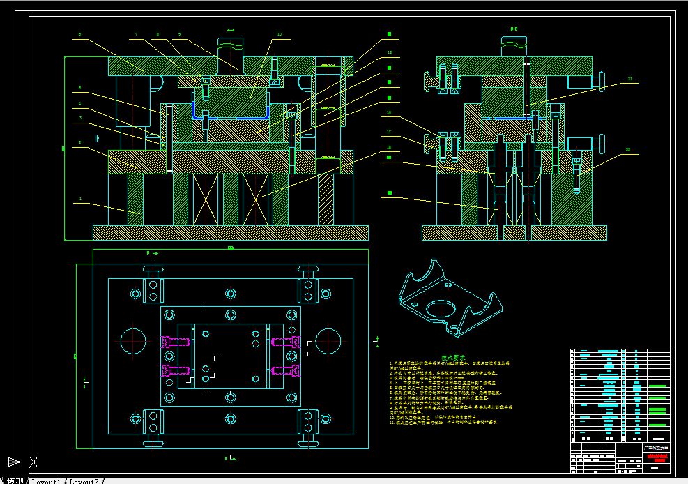 在此,我设计的主要内容是设计某型汽车后悬置支撑座冲压件模具设计,考虑成本、制造难易程度、厂房设备等因素,结合后悬置支撑座零件的结构特点,分落料、冲孔、成型三道工序,设计成单工序冲压模。在本次毕业设计中,依据后悬置支撑座结构特点及所选用的材料,经设计方案、工艺路线分析,通过严格的设计计算和相关资料的查询收集。使用UG三维建模设计软件,初步设计确定模具结构,选用合适的冲压设备。使用CAD二维软件绘制各个工序冲压模具中各零件图及装配图的二维图纸,完成修边冲孔工序模具的设计。