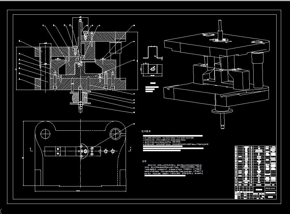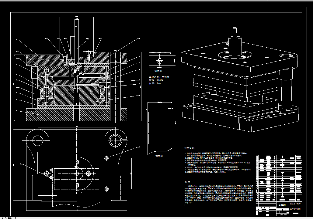 本设计是对给定的 形支撑板进行落料冲孔复合模具、弯曲模具的设计,支撑板所用的材料为Q235A,生产批量为大批量生产。首先,进行工艺分析,通过对支撑板材料、结构、精度分析及模具方案比较,确定使用一套落料冲孔复合模与一套弯曲模进行成形。设计落料冲孔复合模,先选定工艺方案,选定工艺方案后进行毛坯的尺寸计算。计算出来后,根据毛坯的尺寸来计算凸、凹模的尺寸,并且进行冲裁模零件的选取。接着是弯曲模的设计。主要是弯曲力的计算,选用模具进行弯曲,主要零件的尺寸计算,确定凹模的外形尺寸等,选择压力机型号和校核所选用的压力机是否符合。最后用UG和CAD进行两副模具的三维建模、装配图和爆炸图的绘制。