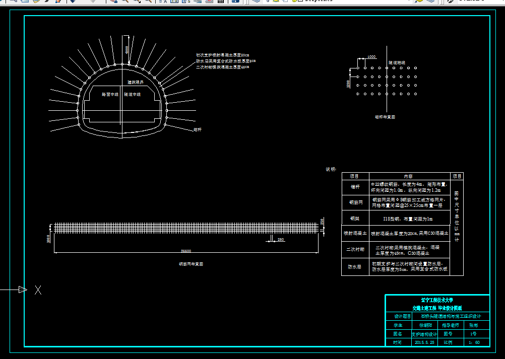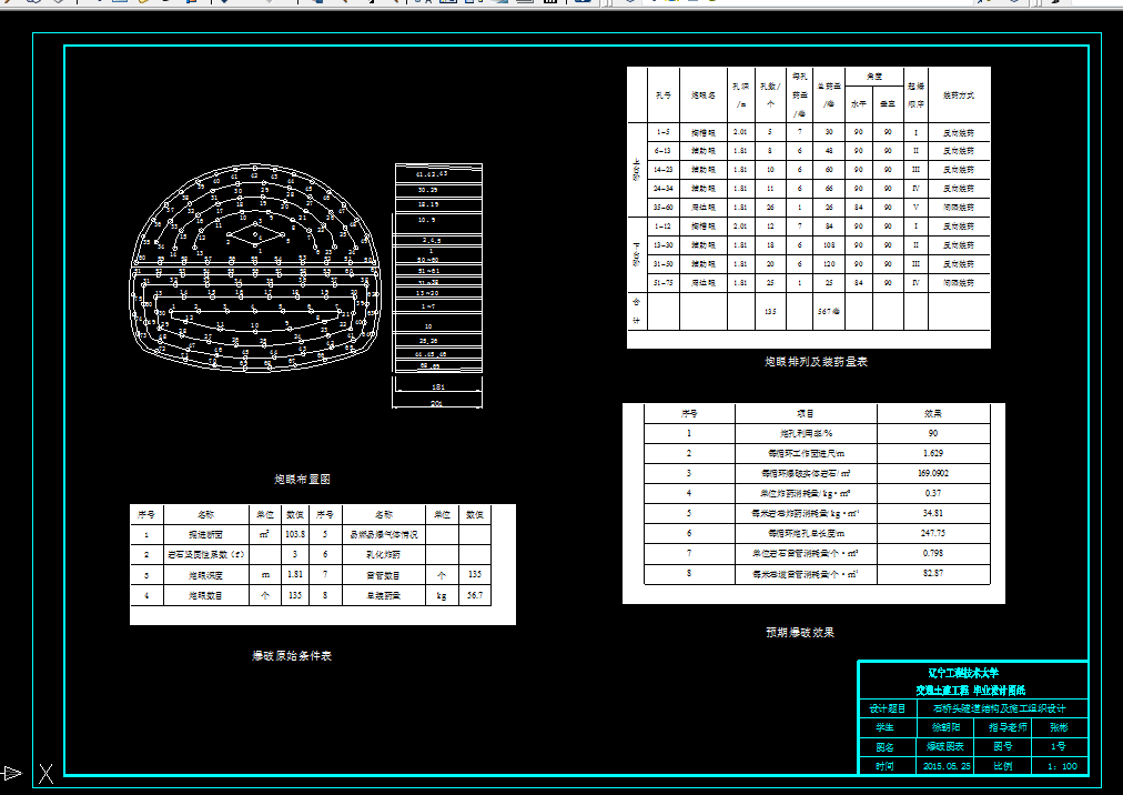 本设计的原始依据为石桥头隧道设计说明书。利用新奥法的施工方法结合本隧道实际水文地质条件,科学合理的进行设计。本隧道进出口段为Ⅴ级围岩,中间段为Ⅲ级围岩,采用台阶法开挖。支护结构选用复合式衬砌,充分发挥围岩自身的承载能力。衬砌结构计算采取浅埋隧道的计算公式,将侧向力视为均不压力。钻爆设计采用光面爆破,根据围岩级别、选用炸药合理设计炮孔的位置和数目。施工组织设计采用三班工作制,两班一循环,根据工程类比法确定个工序所用时间。辅助作业计划详细规定了关于通风、给排水、装渣、运输等工作的具体要求,确保整个施工过程顺利安全地进行。概预算以每米隧道为单位,大致计算了整个工程造价。