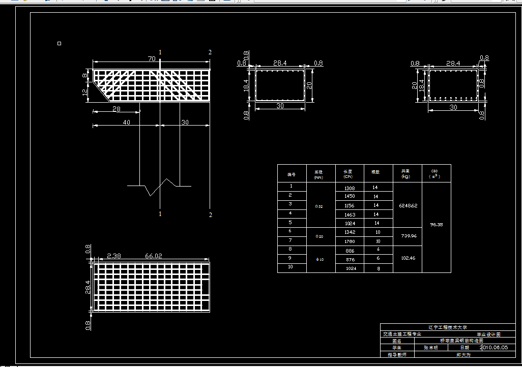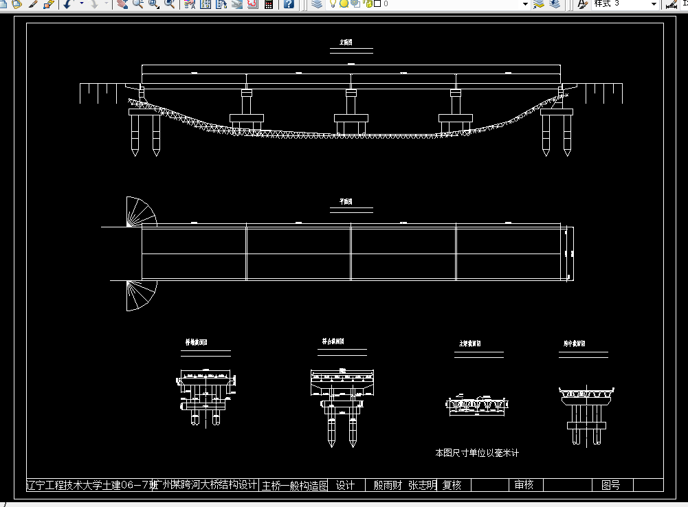 本设计的题目为广州某跨河大桥下部结构设计。该设计是在充分考虑了大桥实际所处的自然地质环境并且综合了大学四年中所学的专业知识理论的情况下得出的。设计内容包括设计资料收集、桥型选择以及方案比选、支座、桥墩、桥台的尺寸拟定、支座设计及验算、墩柱及盖梁的剪力、弯矩的计算及配筋设计、桥台的设计与计算等,具体计算方法涉及杠杆法、偏心受压法等。