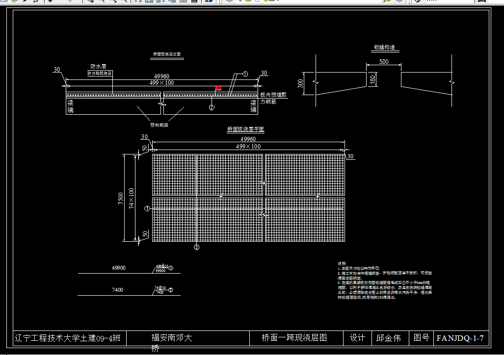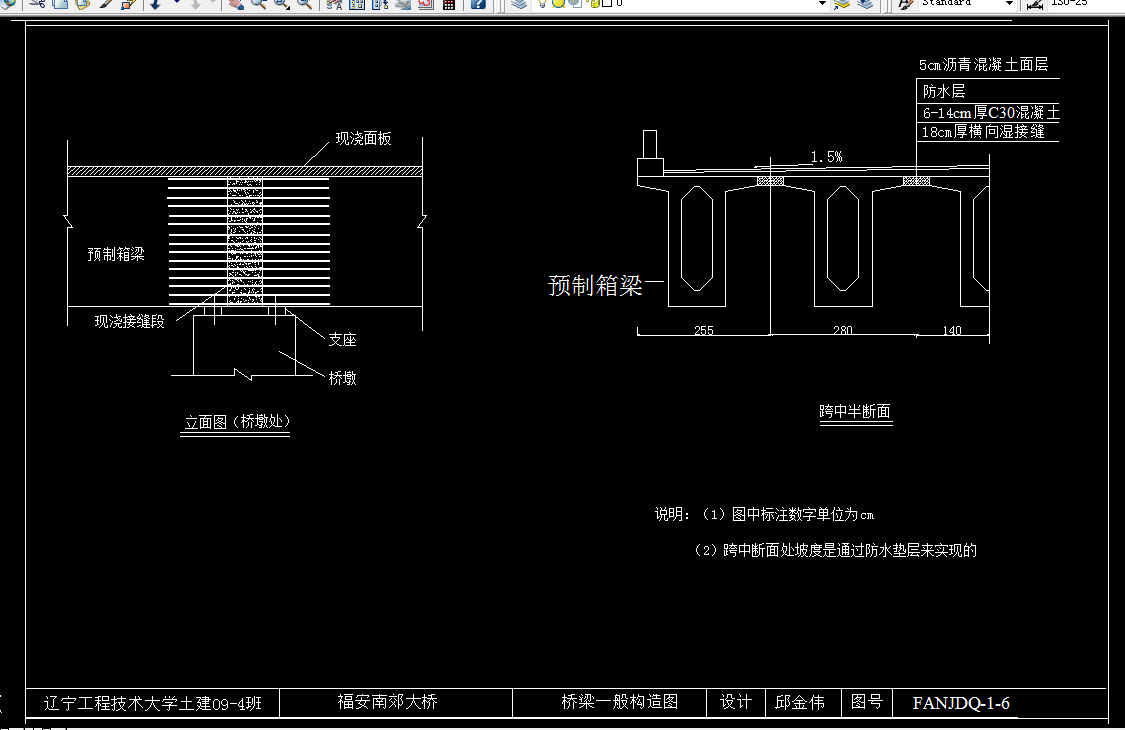 设计主要包括预应力混凝土箱梁截面尺寸的拟定、截面特性的计算、恒载活载内力的计算、行车道板内力计算、配筋设计、主梁挠度计算和附属设施的设计以及根据设计编制概预算与绘制施工图纸。再从结构内力、材料、技术、施工等方面进行了综合考虑作了详细计算分析,做好施工方案。通过设计的计算,全桥结构趋于合理。