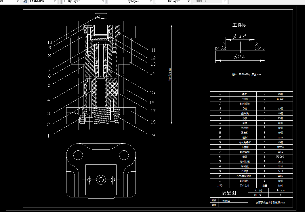 我设计的弯管垫片模具,材料为黄铜H68,厚度t=1mm。传统的加工方法为落料、冲孔、翻边、修整。我的加工方法比较特别。由于材料和厚度的原因,我采用的加工方法为:落料、省去预制孔直接翻边、再利用翻边凸模与翻边凹模的间隙进行挤切修边。从而完成工件的加工。