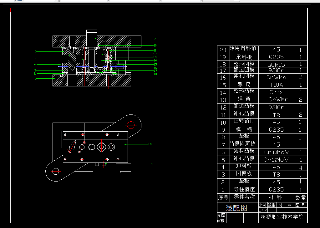 其次设计中还要考虑到它的实际工作环境和必须完成的设计任务,模架采用对角型模架,凹模采用组合凹模,这样可以采用线切割等数控设备来一次完成全部的工序加工,在设计中我要考虑到很多关于我所设计模具的知识,包括它的使用场合、外观要求等,从这里可以知道模具设计是一项很复杂的工作,所以在设计要不断的改进直到符合要求。