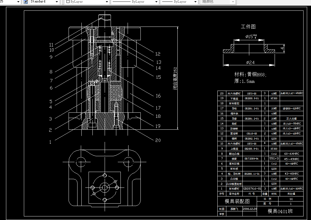 我设计的弯管垫片模具,材料为黄铜H68,厚度t=1.5mm。传统的加工方法为落料、冲孔、翻边、修整。我的加工方法比较特别:由于材料和厚度的原因,我采用的加工方法为:落料、(省去预制孔)直接穿孔、翻孔、再利用翻边凸模与翻边凹模的间隙进行挤切修边。从而完成工件的加工。
