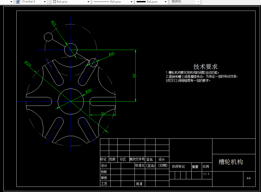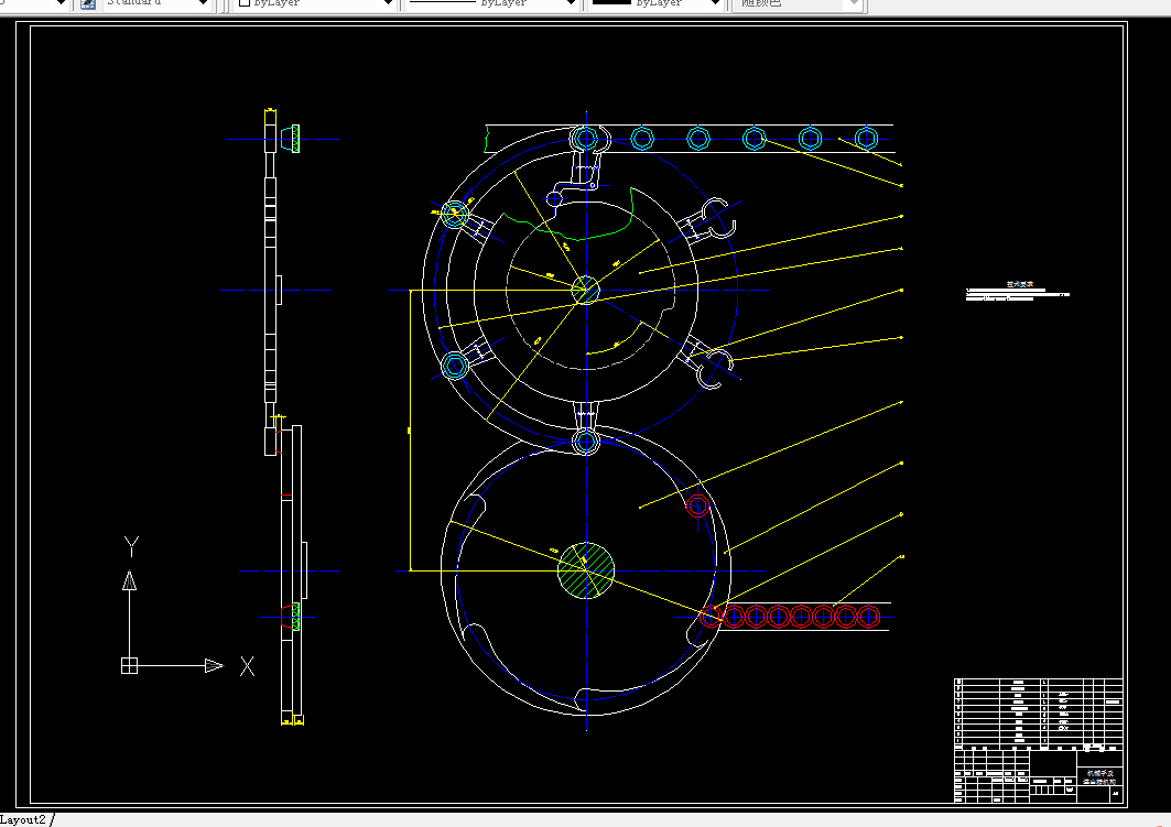 传动系统设计,作为一个动作执行系统,动力是必不可少的,当然对动力的传递系统也就显得尤其重要了。系统功能中要实现机械手转位、送糖盘转位、供纸、剪纸、抄纸、接糖、顶糖及拨糖等功能,它们都需要不同大小的动力,这就需要传动系统的调节。传动系统的设计,包括了带传动,链传动,齿轮传动,六槽轮机构的设计。如在机械手的转位功能中,为实现间歇的转位功能就得通过传动链中的槽轮机构来实现,该机构要保证机械手在转到位后,有一定的停留时间,从而为顶糖、接糖及拨糖功能的实现提供必要的机械动作执行时间。设计好的包装机其生产率可在100~150r/min范围内变动。