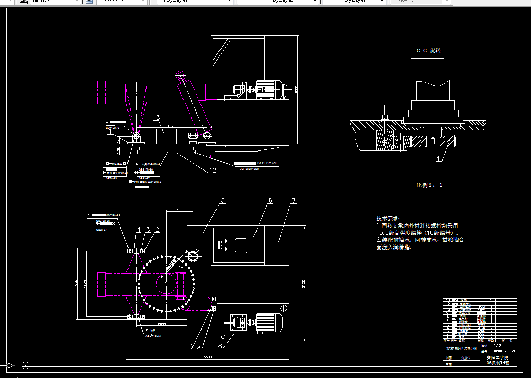 本设计所遇到的难点有:回转支承选型计算和由于工作台旋转,而引起的控制线路的布线设计问题。经过查阅资料、认真计算最终采用结构牢固的三排滚柱式回转支承(13)系列;为使工作台旋转范围大于360度,在回转支承中间设计一个滑环机械,使来自大车、小车的电源线路通过滑环机械引入电气柜;控制线路也通过滑环机械到达小车和大车的驱动电机,为保证装、出料机的运行安全,在控制电路中还设计了大车、小车、旋转等部件运动的电气互锁电路。