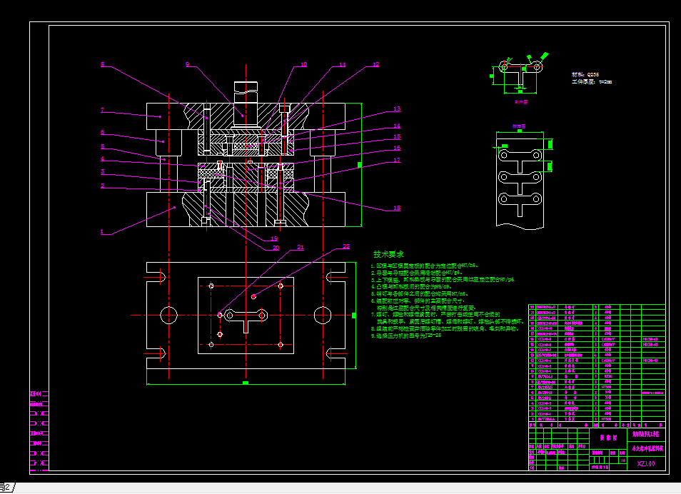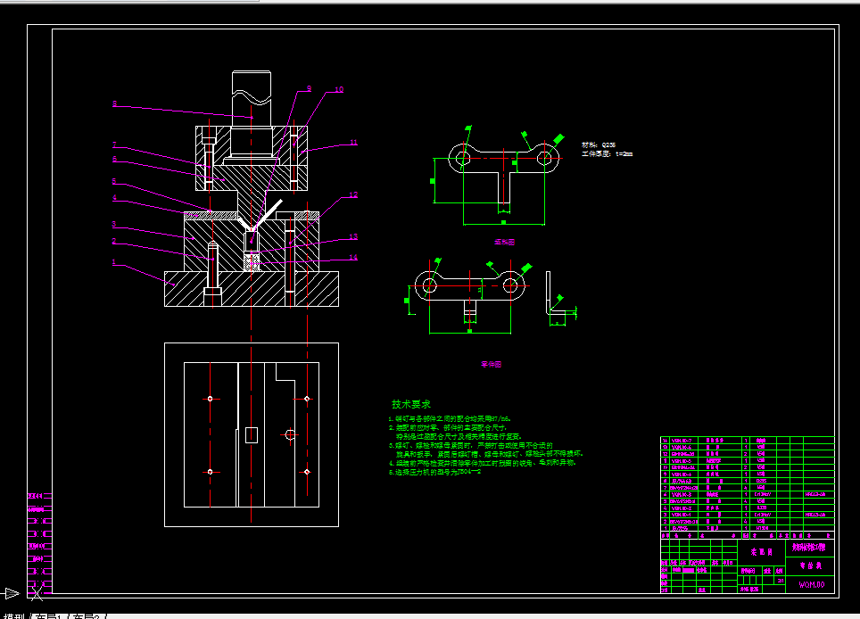 在本次毕业设计的课题是小支架冲压工艺及模具设计,通过对零件的分析可知,该零件所用的材料是Q235钢,大批量生产,在经过方案比较,选择复合冲裁和单工序弯曲作为该副模具工艺生产方案,即容易加工又经济;经过计算分析完成该模具的主要设计计算;选出符合该模具的定位方式、卸料方式、导向方式;设计模具的工作部分即凸、凹模、凸凹模的设计,选择模具的材料和确定每个零件。