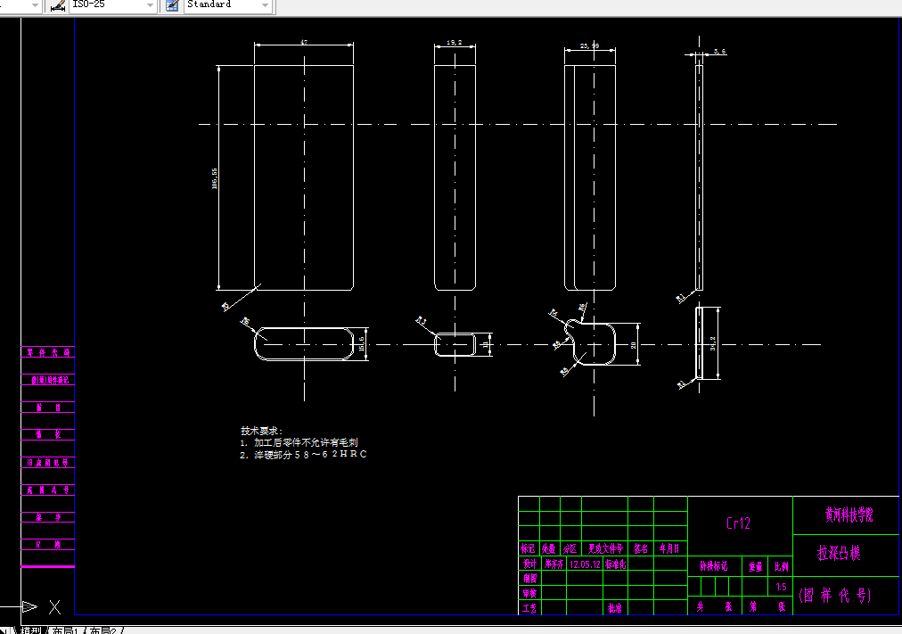 本次任务是设计一个冲裁形状简单,精度要求不高的落料拉深模。在设计过程中先对产品的工艺性进行研究,从而拟定正确、合理的工艺方案;然后进行落料拉深模的结构设计与计算;其中包括对冲裁件的排样的选择、冲裁力的计算及凸、凹模相关设计与计算,并对冲裁模的模架进行正确的选择和各个相关零部件的选取。在凹模设计方面,在确定凹模壁厚时要考虑凹模上螺孔,销孔的定位布置,还对卸料装置进行结构设计与计算和某些部件之间的配合尺寸,在凸模设计时,先要确定卸料板、凸模固定板和导料板的高度,以便凸模总体长度的计算。根据计算得到了凸凹模的刃口尺寸和冲裁力,确定了凸,凹模的尺寸和形状并依次查出了相关主要零部件的结构和尺寸,确定了卸料装置的设计。