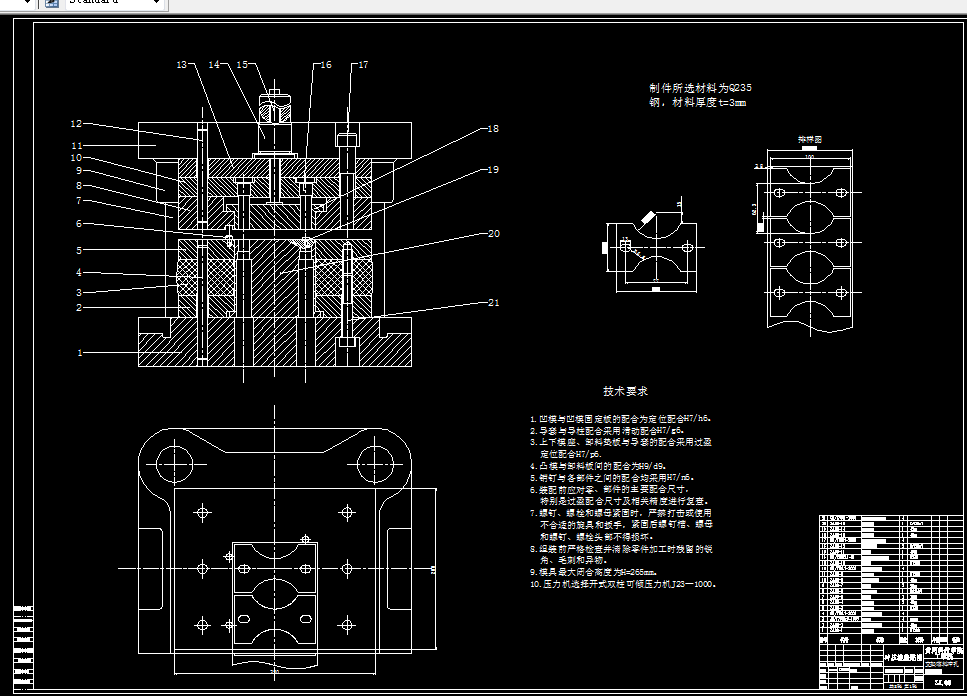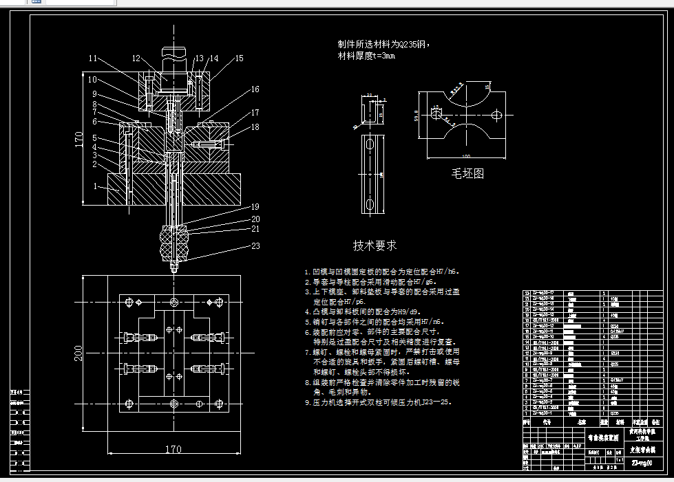 在本次毕业设计的课题是支架冲压工艺及模具设计,通过对零件的分析可知,该零件所用的材料是Q235钢,材料厚度为3mm,大批量生产,在经过方案比较后,选择复合冲裁模和单工序弯曲模作为该工艺生产方案,即容易加工又经济;经过计算分析完成该模具的主要设计计算;选出符合该模具的定位方式、卸料方式、导向方式;设计模具的工作部分即凸、凹模、凸凹模的设计,选择模具的材料和确定每个零件。