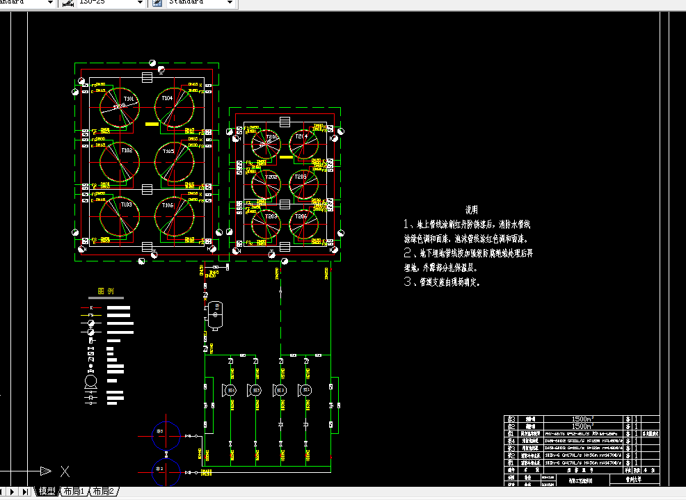 文字说明和数据计算包括油罐区总容量及分区罐容量计算确定;油罐单罐容量及数目确定;罐区总平面布置;工艺流程设计;罐区管线布置设计;泵房安装设计计算;泵型选择计算;泵安装高度计算;油品输送阻力计算及管径选择;罐区消防设计,消防管线阀门布置及计算。