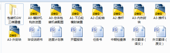 本研究主要包括粉料制袋—充填—封口—立式枕型包装机中横向封口系统设计,通过对包装机的总体方案的分析和设计,在传动系统中,采用二级减速,电机输出动力通过V带连接,经过减速器降速,最后通过一对啮合的锥齿轮将动力传到主轴,带动凸轮机构完成横封装置的封口,切断工序。