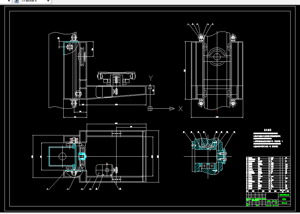 本设计论文主要详细地讲诉了单立柱型有轨巷道堆垛机的结构设计,其中主要论诉了机架的结构设计,起升机构、货叉伸缩机构及行走机构的结构设计和计算。在设计时,从经济和结构方面考虑,在比较单双立柱堆垛机结构方案后选取单立柱方案。根据要求选用单立柱机架,并设计出了具体结构形状,给出相应的参数及制造材料。根据三种机构受力大小不同,各需要的工作功率不同,选用的电动机型号不一样。根据减速比和转矩不同,起升机构和行走机构对减速器的选用各异。同样,制动器、链轮及链条、V带及带轮等都是根据相应设计要求有不同选择。不管怎样,在初步选用类型后,都进行了必要的相应校核,以保证设计合理性和可行性。本次毕业设计所用软件主要有二维软件CAD和CAXA。