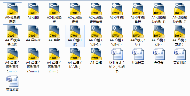 此次,我的毕业设计的标题是接触器触头托片级进模的设计。级进模的优点就是,生产销率成倍的提高。但是,缺点也是显而易见的,那就是级进模的设计难度相对于单工序模的设计难度更高些。现代化的企业,所追寻的目标皆是自动化和高效率。而级进模,一次冲压零件,就可得到想要的成型零件。另外,由专业的送料机器或者是专业的送料机构,和压力机进行配套。从而,实现冲压零件自动化和高效率的生产。接触器,是说电源产生电流,然后电流沿着导体流进线圈,产生磁场,接着磁场产生的磁力使得触头(触点)在磁力作用下合上的一种电器。触头托片,是接触器里面的一个零部件。其作用,顾名思义,就是用来定位和固定接触器触头(触点)的位置。所以,对触头托片的圆孔位置精度要求相对较高。我的毕业设计论文说明书的内容主要有以下几点:对接触器触头托片的材料、结构、工艺性进行分析;拟定接触器触头托片的排样方案和冲压方案;对凸凹模及其他零部件的设计、计算等等。从而,设计出一套符合要求的冲压模模具。所使用到的电脑软件主要有:Solidworks,CAD,CAXA,WPS,VISIO等。当设计、计算出零部件尺寸后,利用Solidworks进行三维建模,然后CAD及CAXA进行二维画图,最后生成、打印符合要求的图纸。