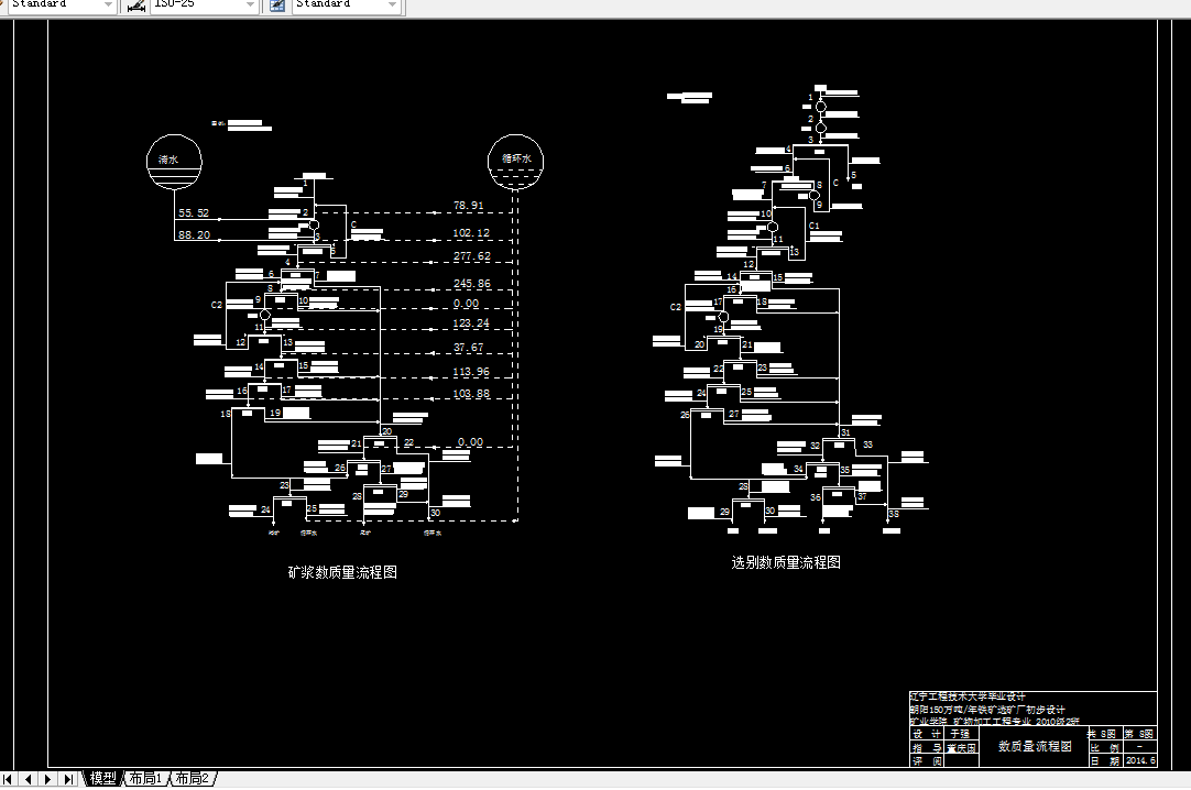 本次设计为朝阳150万吨/年选矿厂初步设计。本次设计原矿品味22.25%,原矿含水3%,最大粒度500mm,入磨粒度10mm,精矿品味66.0%,铁回收率80.35%,精矿含水小于12%。该选矿厂设计采用三段一闭路破碎,两段磨矿,五次弱磁选,一次强磁选的选别工艺,在一次球磨后采用高堰式双螺旋分级机,二磁球磨后采用高频振动细筛。厂房依山而建,节约成本。本次设计采用阶段磨矿阶段磁选的工艺流程,原矿主要由磁铁矿和赤铁矿组成,所以主选别五段弱磁选,选出强磁性矿物,尾矿竟一段强磁选选出弱磁性矿物,达到工艺指标的同时增加产量。
