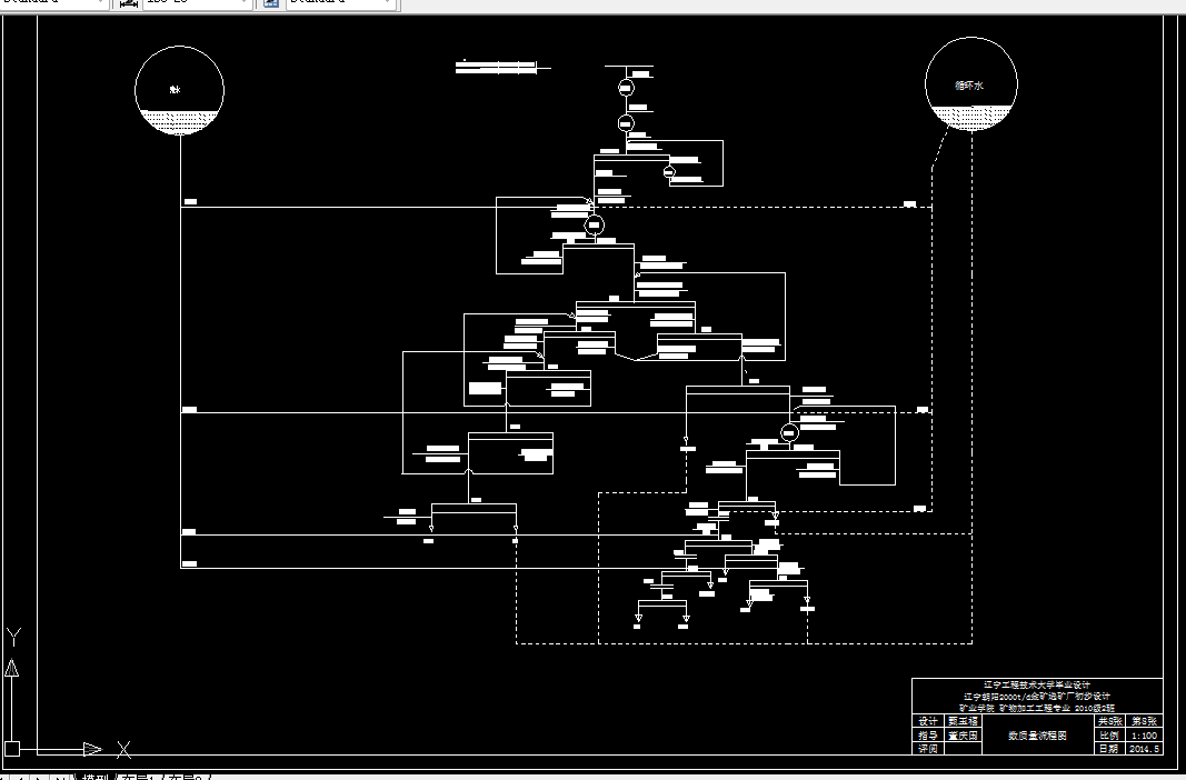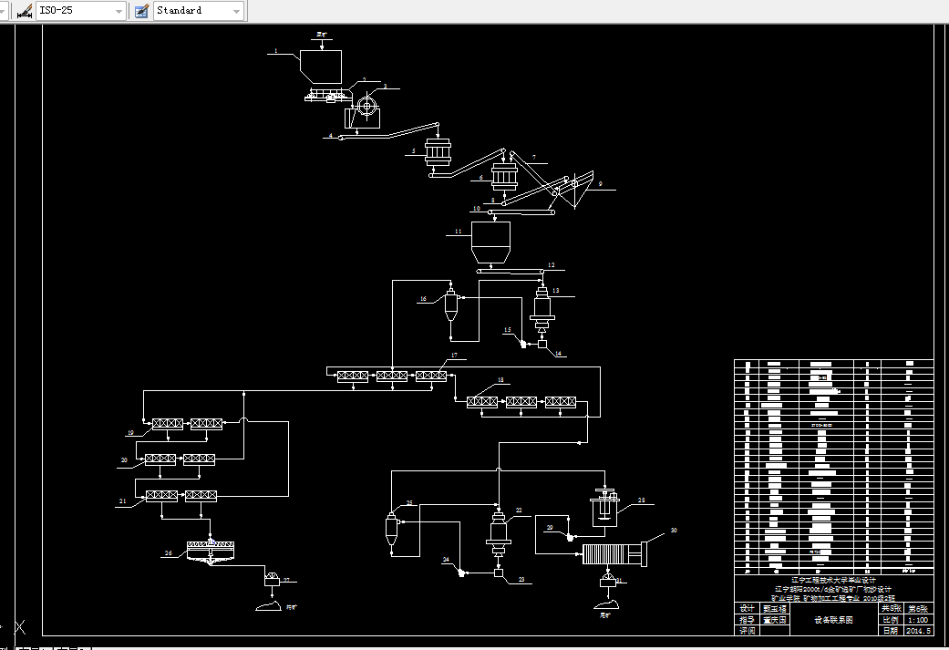 根据对辽宁朝阳金矿矿石性质的研究结果以及对类似选厂的考察,设计辽宁朝阳2000t/d金矿选矿厂。建厂规模为日处理量2000吨原矿石,根据地形考察报告设计为依山坡建厂,破碎位于同一等高线,该矿石属难碎性矿石,粒度嵌布均匀,原矿最大粒度500mm,含水量3%。原矿品位2.47g/t,矿石密度3.25t/ 。破碎段采用三段一闭路破碎流程,磨矿阶段利用阶段磨矿阶段选别,一段磨矿后,精矿经一次粗选、三次精选得到浮选精矿;粗选尾矿经第二段磨矿后,再经过氰化浸出流程,最终得到金精矿。破碎阶段,最终破碎产物粒度为0—10mm。磨矿指标要求达到一段磨矿细度为—200目含量占65%,最终磨矿细度为—200目含量占90%。浮选工艺指标为精矿品位60g/t,回收率90%。氰化浸出工艺指标为浸出率90%,吸附率98.5%,解吸电解率99%,冶炼回收率99%。