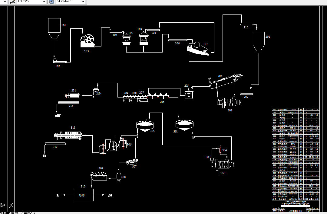 根据原矿资料可知矿石属于中等可碎性矿石。通过查找资料确定总破碎比及各段破碎比,采用三段一闭路破碎工艺,破碎后进入磨矿车间,经过一段磨矿后,进入浮选车间进行浮选。矿浆给入浮选机,经一次粗选、三次精选后得到合格的金精矿。金精矿经浓缩机浓缩后给入带式真空过滤机,生产出含水10%左右的金精矿。 浮选尾矿返回球磨机进行二磨,金泥再氰化浸出。氰化贵液通过炭浆法进行吸附,再经过解析、电解、冶炼等工艺得到金锭;氰化后的尾矿经压滤机压滤后,尾矿运往尾矿干排场地堆存,滤饼含水20%左右。回水作为循环水返回流程继续使用,通过工艺流程选择了经济合理的相关设备。选厂建成投产后,能最大化的回收有用金属,环境方面同样也达到国家标准。
