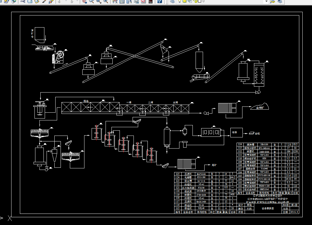 本设计完成了辽宁阜新金矿2000t/d选矿厂初步设计。矿石中的金主要以粒间金和包裹金为主。白铁矿和黄铁矿是金的主要载体。根据矿石可选性研究报告,确定采用三段一闭路破碎,阶段磨矿阶段选别流程。一段磨矿后进入螺旋分级机进行分级,合格粒级进入浮选作业,提前选出粗粒金。浮选作业为一粗三精,最终浮选精矿品位可达到60g/t。粗选尾矿进入二段磨矿,经过水力旋流器分级,溢流进入氰化浸出作业,最后经过解析电解冶炼后成为金锭。本设计还完成了工艺流程计算,设备选型,厂房布置,经济概算等工作。并绘制了设备联系图、厂区总平面图、厂房刨面图。