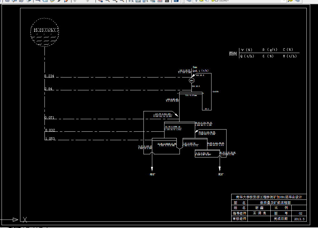 为了制定工艺成熟,生产可靠,经济效益高的设计方案,本设计参考了大量设计资料,然后根据矿山实际情况,确定了各车间合理的的工作制度,拟定了工艺流程,即采用三段一闭路的破碎流程,一段闭路的磨矿流程,一粗一精二扫的浮选流程,先浓缩后过滤的脱水流程。本设计对工艺流程中各个工艺指标进行了计算,包括破碎、筛分、磨矿、浮选(含矿浆流程)。对破碎、筛分、磨矿、分级、浮选、脱水及辅助设备进行了选择和计算,最终确定了所需的工艺设备。本设计还进行了厂房的总体布置,并进行了厂房内的设备配置。其中,粗碎、中细碎、筛分厂房分开布置。磨矿浮选共厂房布置,其中磨矿采用纵向配置,浮选机采用横向配置。浓缩机配置在露天,过滤机与精矿仓配置在厂房内。
